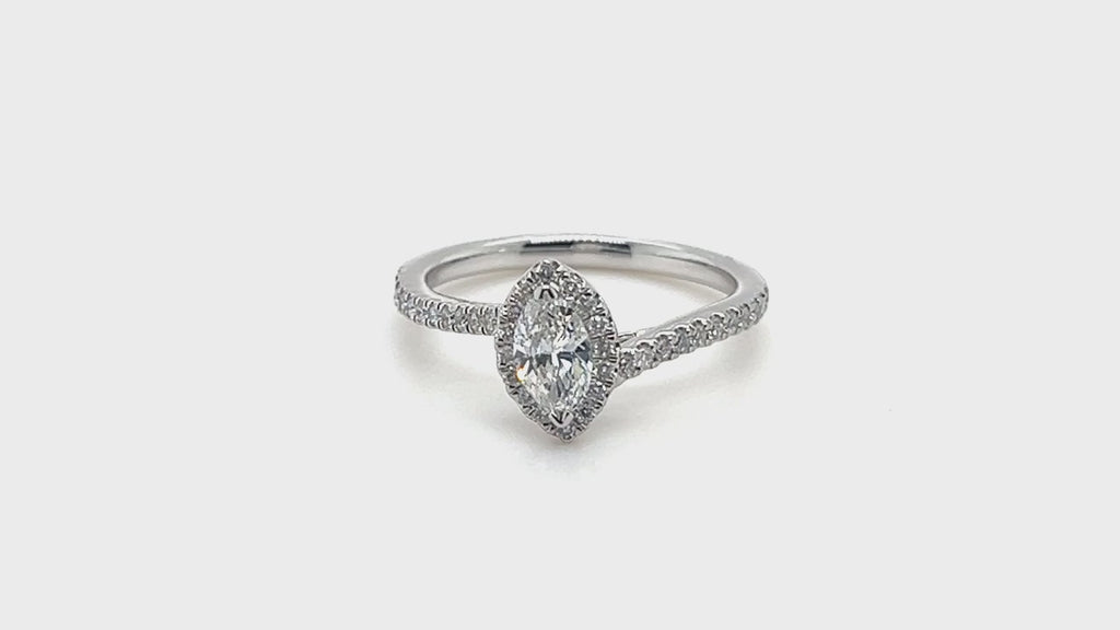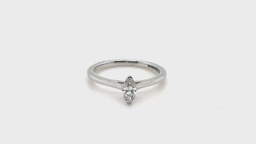 Because you want a beautiful diamond engagement ring that looks larger than its price tag might suggest, you should look at our range of lovely marquise shape diamond engagement rings. The marquise cut has a long ovoid shape with plenty of facets to create the sparkle that everyone expects. The elongated shape will flatter the fingers of the wearer and the ovoid shape looks larger per carat than most other diamond shapes. When you choose a diamond ring with a marquise shape central gemstone you will be choosing with your heart, for beauty, and your head for value!