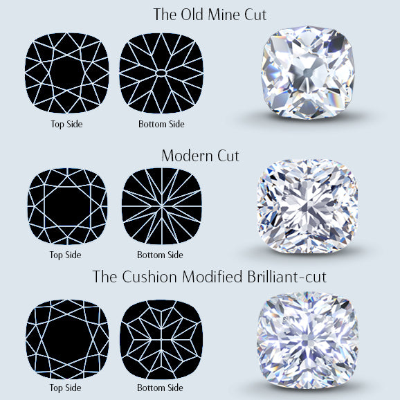 The original version of the cushion cut, developed centuries ago, had a large culet (a point at the base of the diamond) a relatively small table (the top flat facet) and steeper angles than used today. The old mine diamond was attractive in appearance, had an engaging, somewhat blocky, flash of light but lacked the brilliance and sparkle of more modern designs.