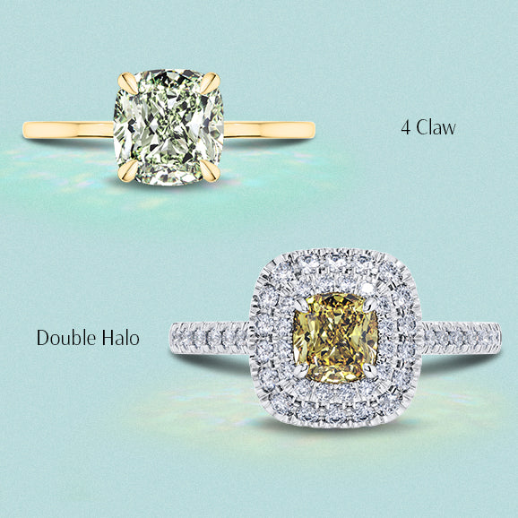 Halo settings have become very popular for cushion cut diamonds. The surrounding of smaller diamonds tends to make the central gem look larger at a much lower cost than buying a larger diamond of equivalent diameter. The smaller diamonds will also give a ring more sparkle than the central diamond on its own.