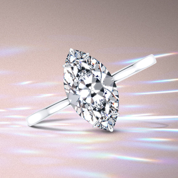 East-West is not an official name for a setting but rather a way of aligning the diamond. Typically, a marquise cut diamond is aligned along the length of the finger, but setting the stone across the fingers creates a big visual impact. This effect works best with larger diamonds of 2 carats or higher, which will be wider than the width of the finger. With a smaller diamond, the width of the marquise will be less than the width of the ring’s band losing the effect. With smaller gems, vertical alignment is best.