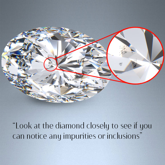 Experts suggest that a clarity rating of VS2 or SI1 will give a beautiful stone – if well-cut. If looking at a VS2 diamond check that there are no visible inclusions when looking into the diamond from above.