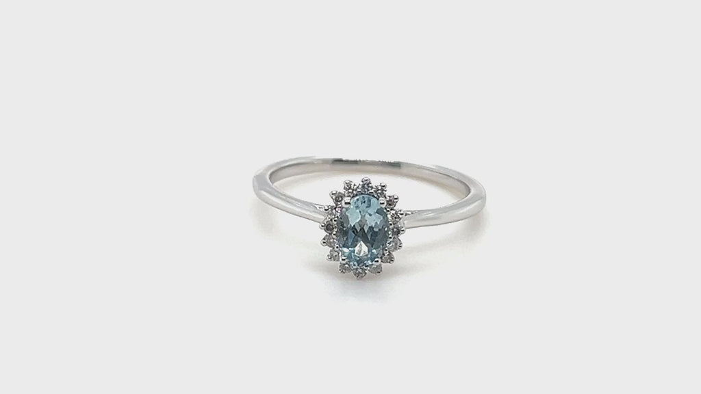 This ring is the one to have if you want something stylish and pretty! Modern British jewellery design is combined with the everlasting attraction of gleaming white 9k gold in this contemporary aquamarine and diamond ring. This eye-catching ring includes an oval-cut aquamarine weighing 0.40 carats, accented with a halo of 0.10 carats of genuine G/SI quality diamonds, and a simple, elegant design. Because it is made of glossy white gold, this ring has a stunning brilliance and shimmer.