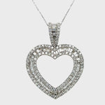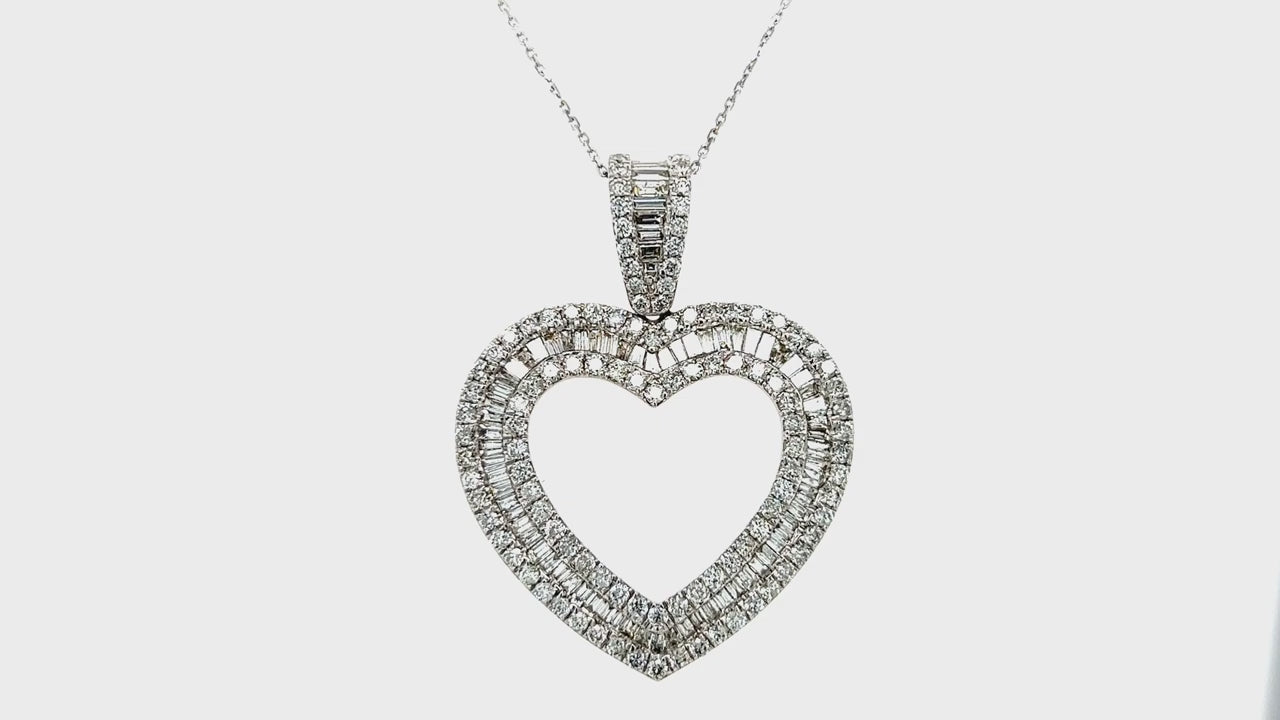The heart is the eternal symbol of love and affection, so this heart shaped pendant makes the ideal gift for somebody very special! Featuring 2.75 carats of G/SI quality diamonds, this necklace will enhance the neckline of any woman who enjoys beautiful jewellery. The pendant measures 29.5mm at its widest part and features a blend of sparkling round and shimmering baguette cut diamonds. The setting is 9k white gold.