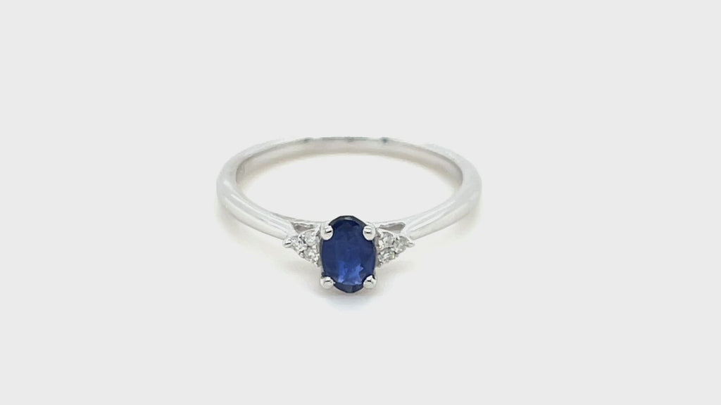 An oval blue sapphire with multiple facets weighing 0.55 carat is the centrepiece of this sapphire and diamond cluster ring. The natural sapphire is flanked by clusters of diamonds weighing a total of 0.04 carat. The diamonds are of G/SI quality and are each cut to a round brilliant shape for eye catching sparkle. The band is a UK hallmarked 9k white gold design. We are proud to offer our craftsmen’s work to you with a lifetime workmanship guarantee.