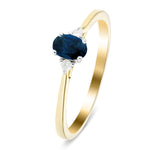 Here is a stunning sapphire and diamond ring with three sparkling stones. The oval-shaped, 0.60 carat blue sapphire has been expertly cut and polished. Two genuine diamonds of G/SI quality weigh a total of 0.06 carat and complement the sapphire's lustre. The band of this ring is crafted from 9 carat yellow gold and is hallmarked in the United Kingdom. You'll want to keep and show off this ring at all your special events!
