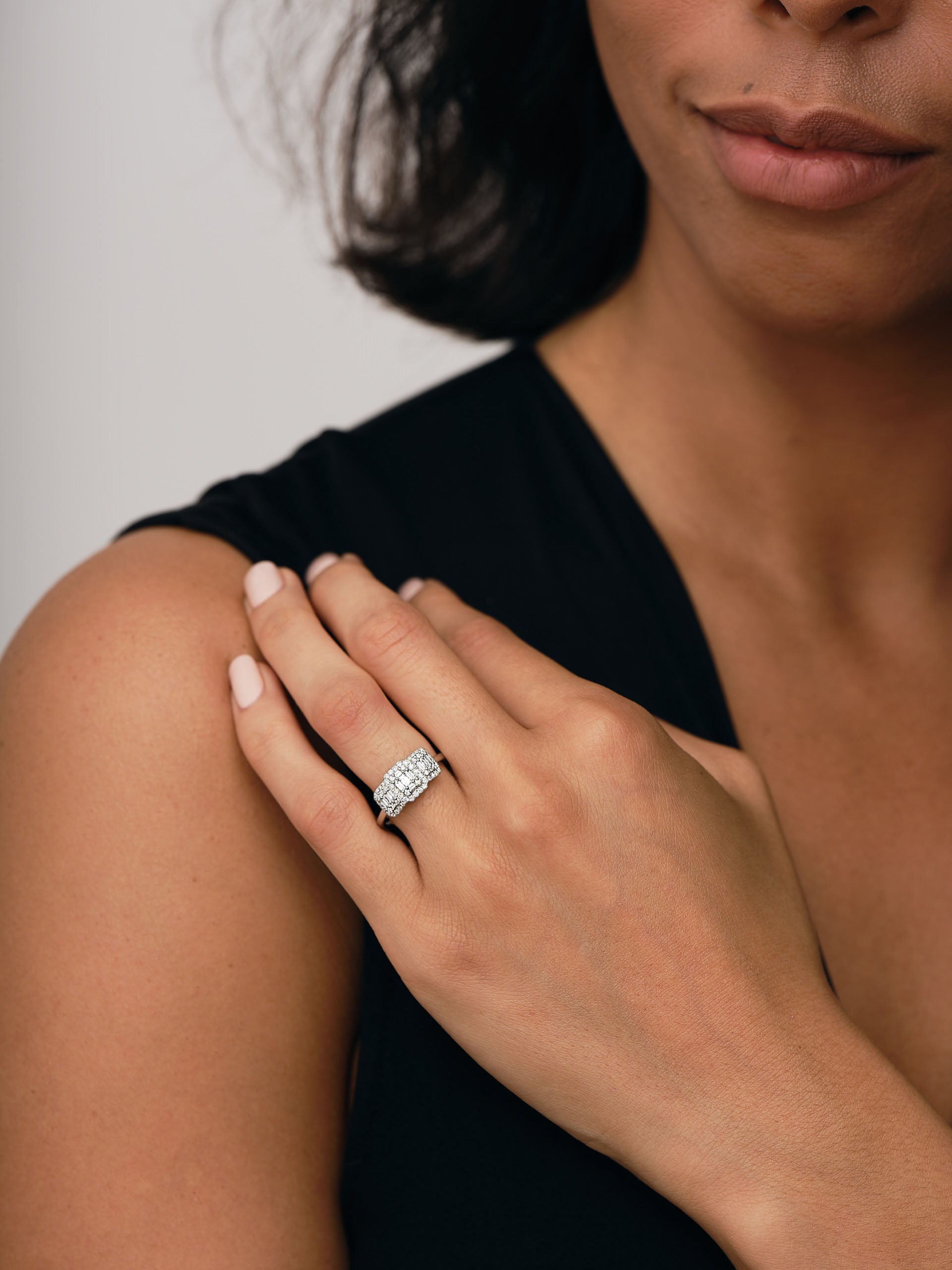 She's special, so why not give her a special ring? Preferably one with diamonds and gold. This piece is a cluster of 0.45 carats of G/SI graded diamonds set in UK hallmarked 9K white gold that will surely catch her eye. Handcrafted in the UK using a stunning mixture of round cut and baguette diamonds this ring will get her noticed for all the right reasons. And when she slips it on her finger, she'll know that you're serious about being together forever.