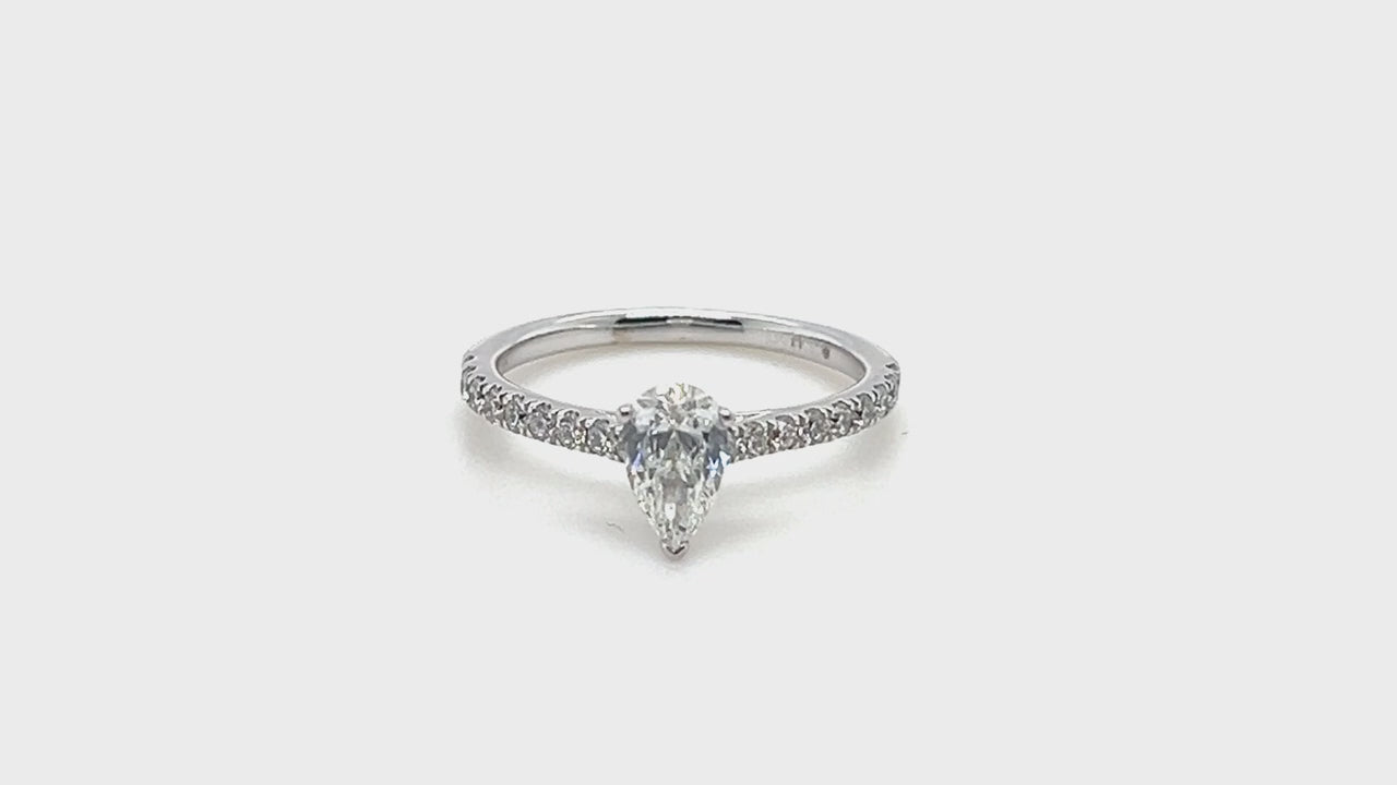 This alluring pear-shaped diamond engagement ring is the ultimate symbol of your love and affection. The main diamond is a stunning pear-cut diamond, with diamond accents along the band adding to the sparkle. With a total diamond weight of 0.50 carats, the diamonds are E/VS quality. This ring is sure to make her heart skip a beat. The pure platinum band is handcrafted with precision and care, and the ring comes with a lifetime workmanship guarantee and a diamond certificate.
