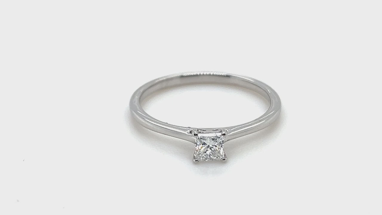 It goes without saying that most upcoming brides prefer diamonds for their traditional engagement rings. Why? They represent dedication and love and are dazzling and sparkling. And she'll turn heads every time she wears this classically designed ring with its timeless design and stunning lustre! A brilliant princess-cut diamond weighing 0.30 carats is set in this gorgeous platinum ring. The gem has an E/VS quality certification from EDR.