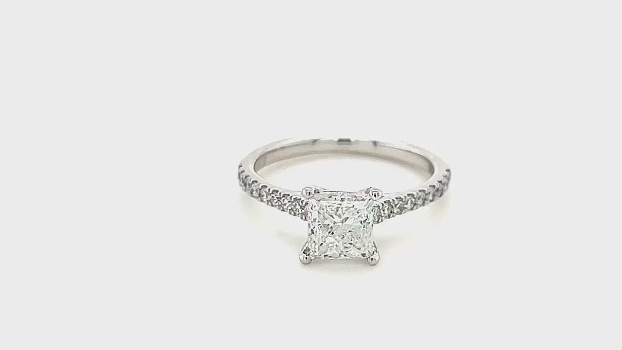 A stunning, handcrafted engagement ring featuring a sparkling princess cut diamond in a classic four-prong setting, accentuated by a band of glittering accent diamonds. Made with G/SI quality diamonds and crafted from 18k white gold, this ring is guaranteed for a lifetime of wear and comes with a diamond grading certificate. The total diamond weight is 1.80 carats. Designed and crafted in the UK, and hallmarked for quality assurance.