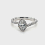 Experience the allure of this Certified Twist Marquise Diamond Halo Engagement Ring in 18k White Gold, featuring a central 0.30ct G/SI quality marquise cut diamond, complemented by an additional 0.30ct diamonds along the shanks of the gold band and forming a sparkling halo around the centre diamond. Handcrafted and designed in the UK, every piece promises enduring beauty with a lifetime workmanship guarantee and UK hallmark.