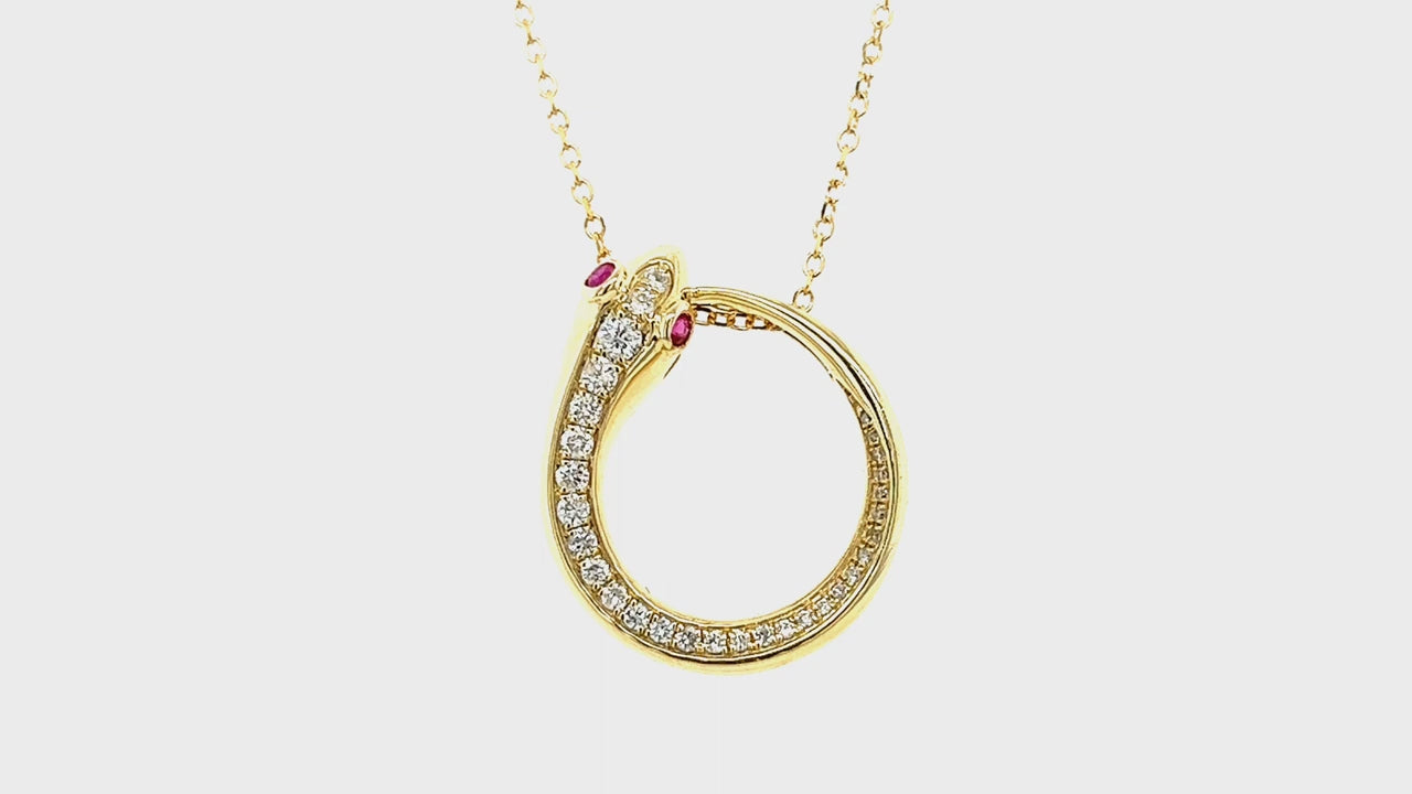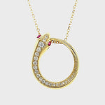 This is an original looking design with a 9k yellow gold snake with white diamonds along its back and two rubies marking its eyes! The snake appears to be eating its tail to make a circular motif. The diamonds weigh a total of 0.25 carats and are all of G/SI quality.  The pendant is suspended on a 9k yellow gold chain. The piece has a diameter of 15.5mm and carries a UK hallmark of purity. This is a delightfully fun piece of jewellery to be worn with pleasure!