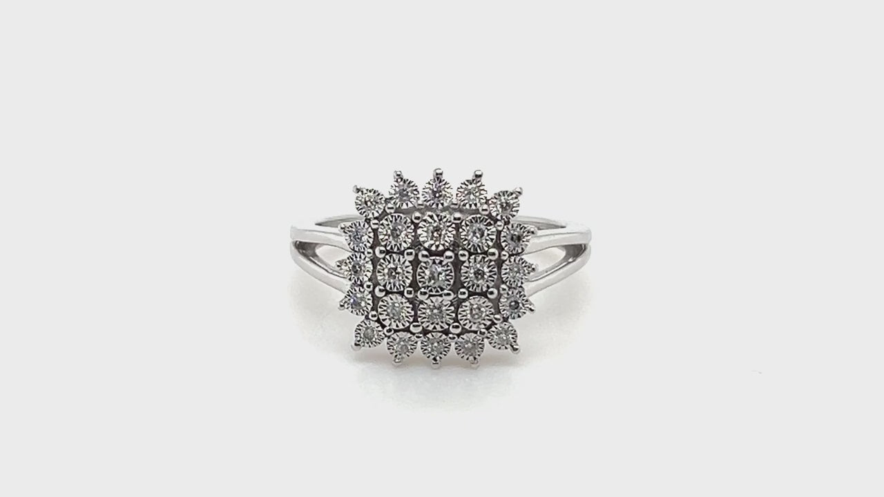 This is a stunning diamond ring with a cushion shape using a total of 0.20 carats of G/SI quality diamonds set into a cushion shape using illusion settings. The illusion settings give the visual impact of as much as 3.00 carats of diamonds at a fraction of the cost. The head of the ring measures an impressive 13.0mm across on a UK hallmarked 9k white gold band. This is ideal if you want to make an impression on a budget!