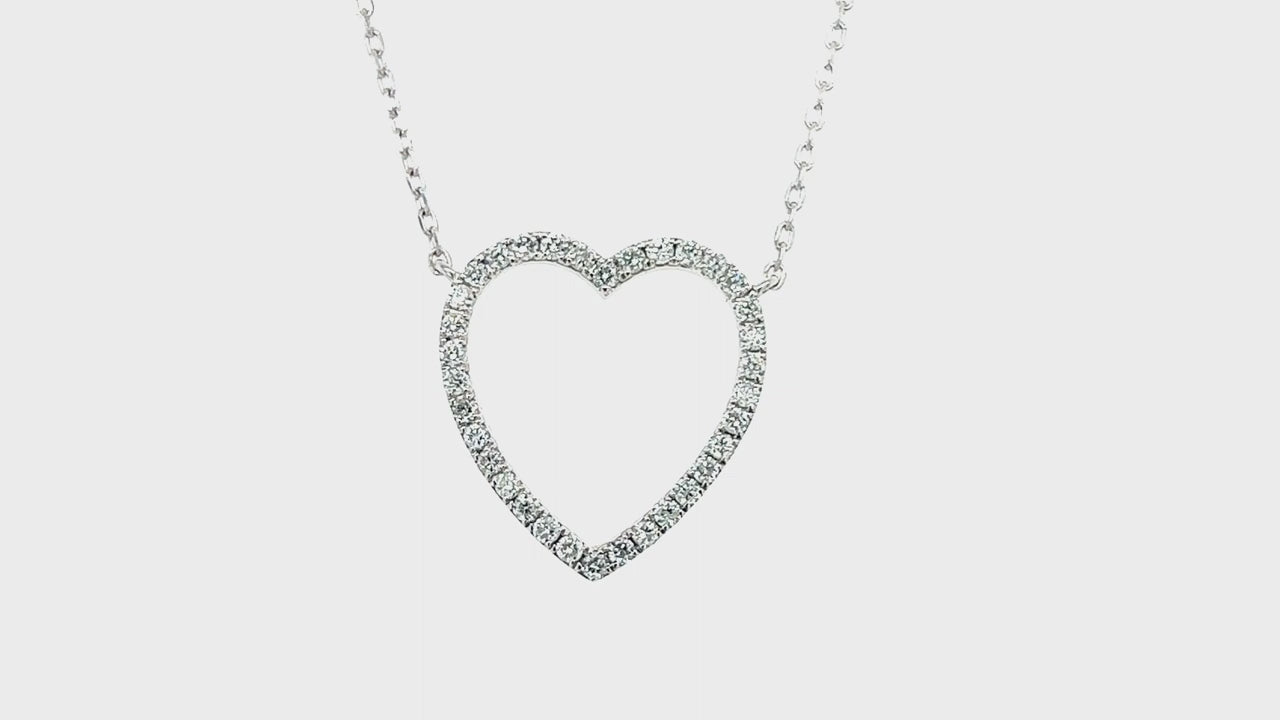 This stunning pendant necklace features a heart-shaped design set with 0.55 carats of sparkling G/SI quality diamonds. The diamonds are brilliant-cut round shaped and claw set into 9k white gold. The heart shape of the pendant and the sparkling diamonds make it a perfect gift for that special somebody or a beautiful addition to your own jewellery collection. The white gold adds an extra touch of elegance to this necklace. It will be a perfect piece for any occasion.