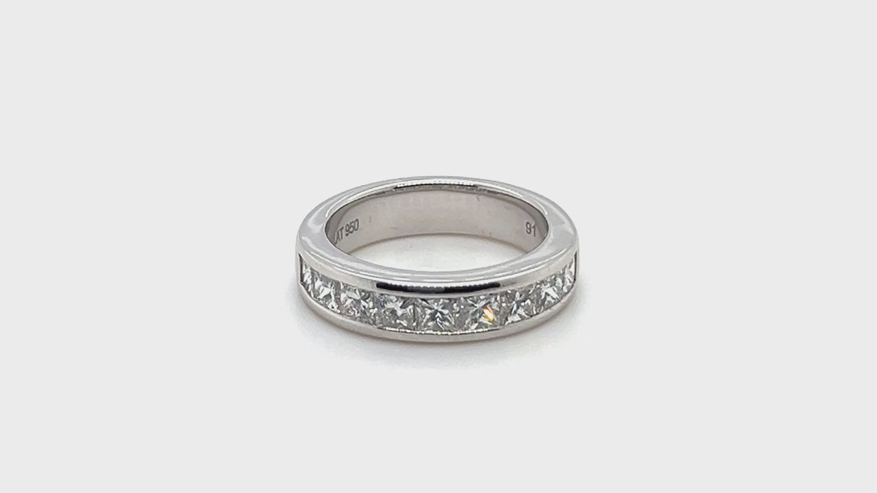 This gorgeous ring is skilfully crafted from shimmering platinum metal. This striking half eternity ring is classically channel set with 1.50ct of ethically sourced G/SI quality princess cut diamonds, hand-cut into nine alluring round-cut diamonds and placed with care in a classic channel setting in the middle of a 4.4mm wide UK hallmarked platinum band. This beautiful diamond ring is certain to seal your love for your loved one on your special day or special occasion.?