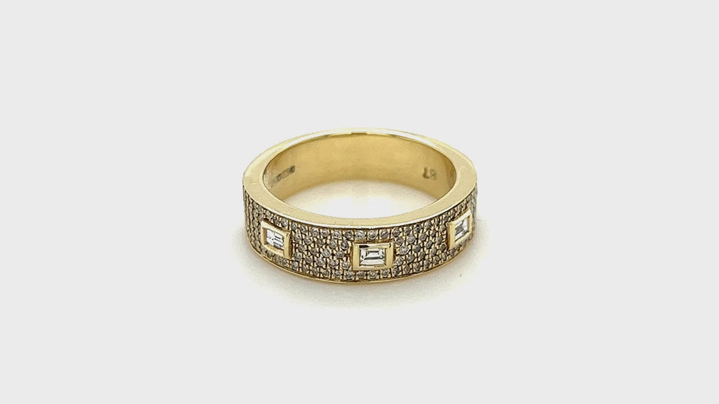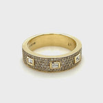 This is a gold wedding ring set with diamonds in a gorgeous blend of round and baguette shaped stones. The baguette diamonds are placed in rub over settings, and the round accent diamonds are pave set. The diamonds weigh a total of 0.55 carats and are of G/SI quality. The band measures 5.3mm across and uses 9k yellow gold with a UK hallmark. This distinctive and stylish wedding ring will stand out from the crowd.