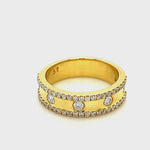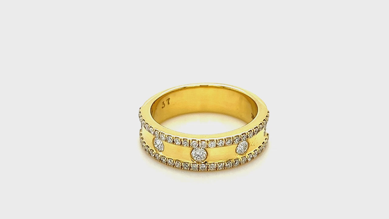 This elegant diamond wedding ring features a combined diamond weight of 0.60ct, all of G/SI quality. The ring is handcrafted in 18k yellow gold with round diamonds running around the circumference of the ring and two rows of accent stones on the outer edges. The diamonds are set using rub-over and claw settings. The ring is handcrafted in the UK. It comes with a lifetime workmanship guarantee. This ring is a timeless symbol of love and commitment.