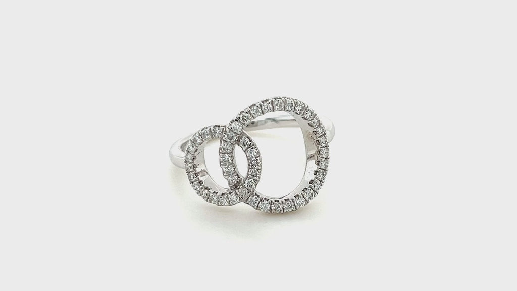 Celebrate the continuity of life with this double-diamond circle ring. The ring features two intersecting circles, each adorned with diamonds weighing a total of 0.40ct and all of G/SI quality. The ring is crafted in 9k white gold, adding a modern touch to a classic style. The diamonds symbolise eternal love and commitment, making this ring the perfect symbol of your love story and the journey you will undertake together. A timeless piece that will be cherished for a lifetime.