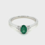 This beautiful ring is a wonderful symbol of love and commitment. The emerald is the birthstone of May. The lovely green emerald weighs 0.35 carat and is flanked by two clusters of G/SI graded white diamonds weighing a total of 0.04 carats. The band is made with UK hallmarked 9k white gold. This UK designed and handcrafted ring will make the perfect match for your hand. This delightful emerald and diamond cluster ring is handcrafted and designed in the UK.