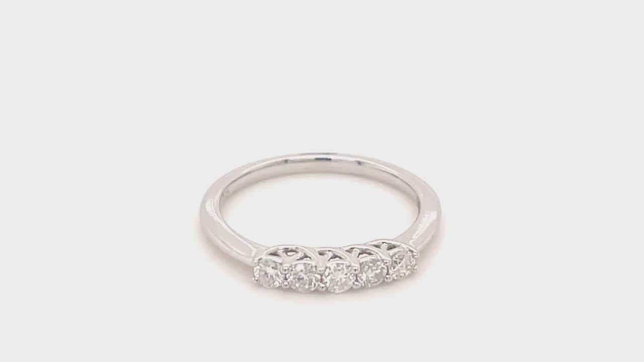 This dazzling five stone diamond ring is elegant and bold.  Five sparkling, ethically sourced sparkling diamonds adorning the shining 18k white gold band which effortlessly draws attention to her finger. This jewellery piece is gorgeous and is sure to take her breath away when you place it upon her finger.