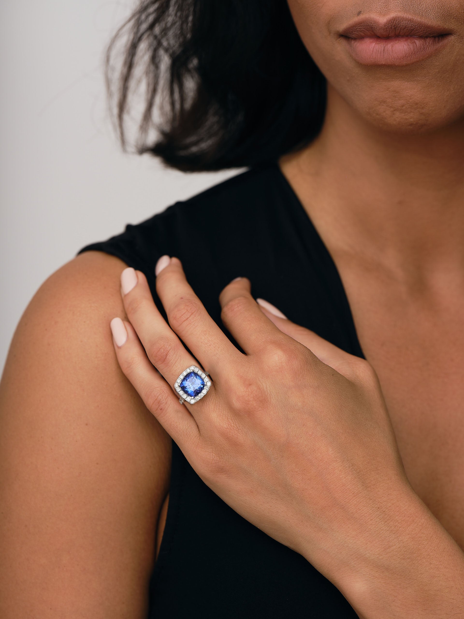Halo Cushion Tanzanite 5.37ct and Diamond 1.00ct Ring in Platinum - All Diamond
