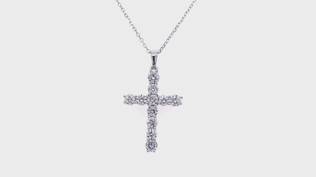 This classic claw set diamond cross pendant is a stunning neckline accessory. With a carat of G/SI quality conflict-free diamonds set in shimmering 18k white gold, this will catch anyone’s eye! The diamonds have claw settings for maximum sparkle. The cross measures 15.6mm X 21.5mm. This is the ideal luxury gift for any special occasion. Handcrafted in the United Kingdom, we offer this cross necklace with a lifetime workmanship guarantee.