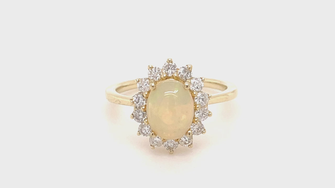 A unique, modern and striking ring that you'll want to wear again and again. Opal is one of nature's gems, with natural beauty and unique texture that adds an elegant and distinctive touch to any style. This ring is set with an oval opal weighing 1.12 carats and surrounded by a cluster of G/Si quality white diamonds weighing a total of 0.52 carats, all in a beautiful 9k yellow gold setting. The vibrant colours and shimmering patterns make this stone popular for fine jewellery.