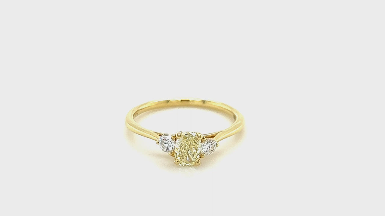 This diamond engagement ring is a beautiful blend of traditional and modern styling elements. The centre stone is an on-trend fancy yellow diamond cut into an oval shape. The 5.6mm ring head is accented with two round white diamonds that create contrast between the yellow diamond and classic yellow 18k gold band. The total diamond weight is 0.75 carats, and the diamonds are of G/SI quality.
