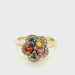 A perfect ring for your special someone, this sapphire and diamond cluster ring is a true treasure. Made from 9k yellow gold and set with 0.95 carats of multi-coloured sapphires and 0.25 carats of G/SI quality diamonds, it's sure to be a favourite. This ring will be a colour bomb on your fingers. Be prepared to attract attention every time you place it on your finger! The ring has a lifetime workmanship guarantee.