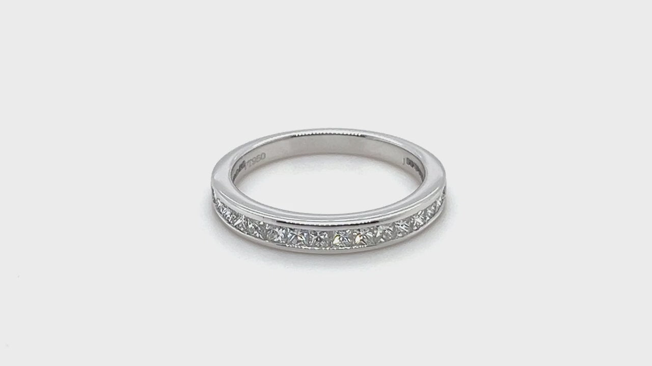 Half a carat of ethically sourced diamonds, hand-cut and shaped into princess cut are securely set in an opulent 2.8mm width platinum band for a breath-taking and eye-catching result. A piece that shows how much you care. This fashionable, striking half eternity ring from our skilled UK craftsmen's workshop is proudly sold with a lifetime guarantee.