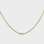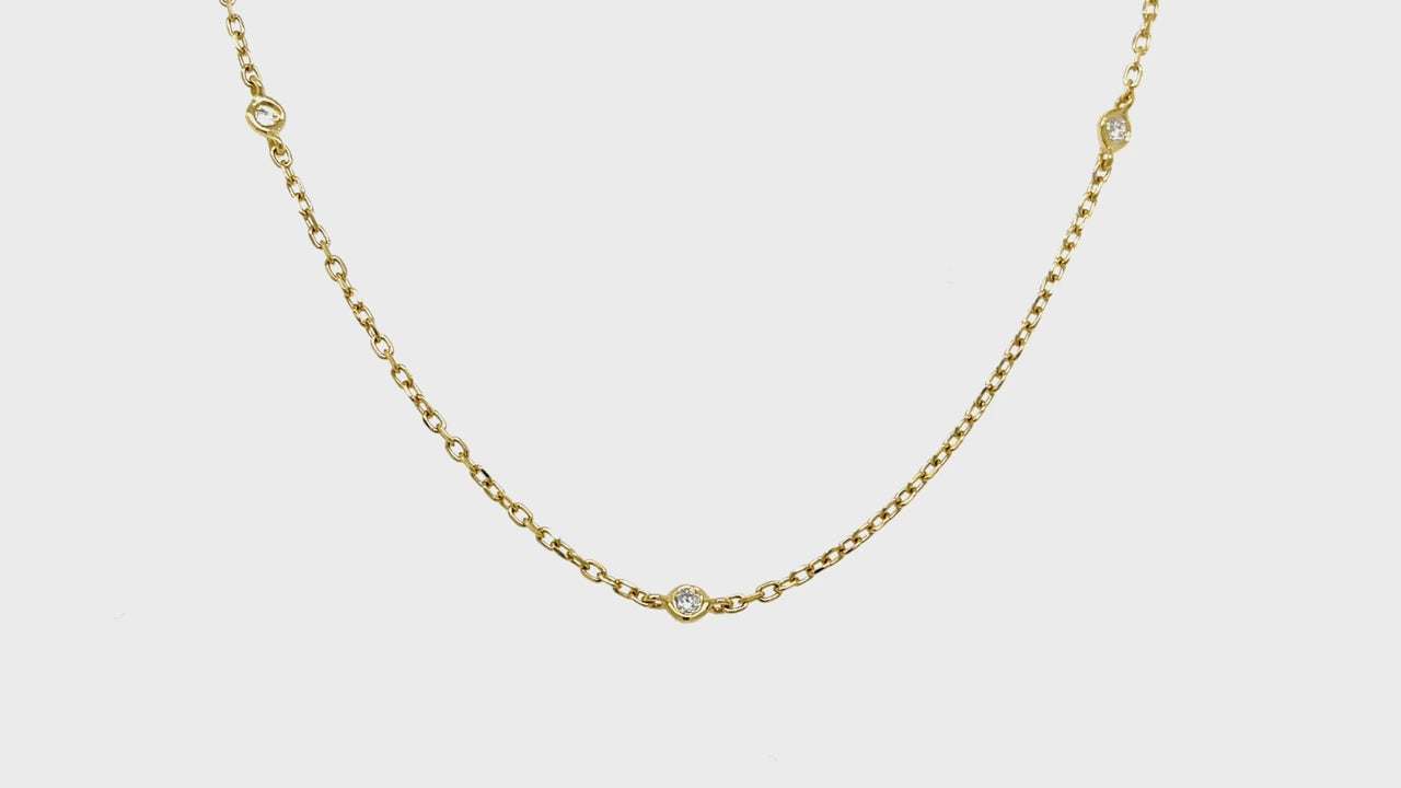 A gorgeous round diamond necklace with a comfortable fit. Each 16" long necklace is strung on the finest quality of 18K solid yellow gold. The necklace has 8 round, G/SI graded diamonds in rub over settings. The classic round diamond necklace is a timeless fashion staple. Crafted in a classic setting, this diamond necklace is sure to become a favourite. You can be confident knowing that this diamond necklace has a lifetime workmanship guarantee.