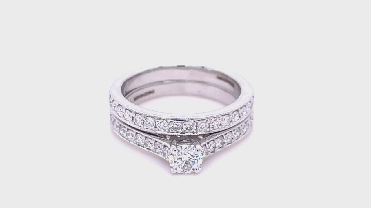 We know you want everything about your special day to be perfect. Ensure matching rings are one thing less to worry about with this beautiful bridal set in brilliant 18k white gold with the sparkle of 0.90 carats of hand-cut, ethically sourced, diamonds. Wedding and engagement ring matched flawlessly by our British craftsmen to give her timeless beauty for the rest of your lives together.