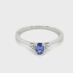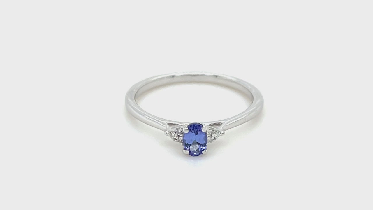 This tanzanite and diamond cluster ring is a real treat for the eyes! This ring features a 0.25 carat tanzanite cut into a faceted oval shape. Accentuating the blue/violet colour are two clusters of G/SI quality diamonds set either side of the centre stone. The natural diamonds weigh a total of 0.03 carat. The band of the ring is made with UK hallmarked 9k white gold. The ring is sold with the reassurance of a lifetime workmanship guarantee.