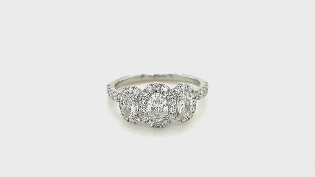 Make a statement of love and commitment with this stunning three-stone oval diamond cluster engagement ring. Expertly crafted in platinum, this ring features 1.40 carats of G/SI quality diamonds that dazzle and sparkle with every movement. The three oval diamonds are set in a unique cluster design with diamond halos that add glamour and elegance to the ring. Take advantage of this opportunity to own a ring that will make you and your loved one feel special.